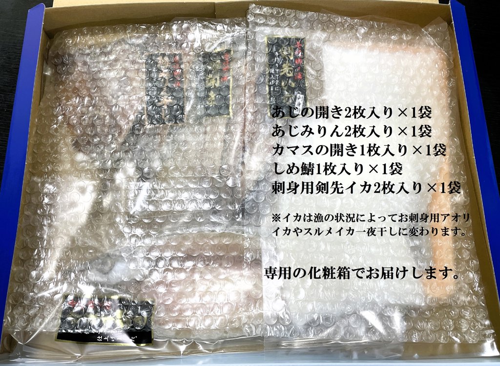 あじの開き2枚入り×1袋 あじみりん2枚入り×1袋 カマスの開き1枚入り×1袋 旬しめ鯖1枚入り×1袋 お刺身用剣先イカ2枚入りまたはお刺身用アオリイカ1枚入りまたはスルメイカ一夜干し2枚入り×1袋(季節によって変わります) |