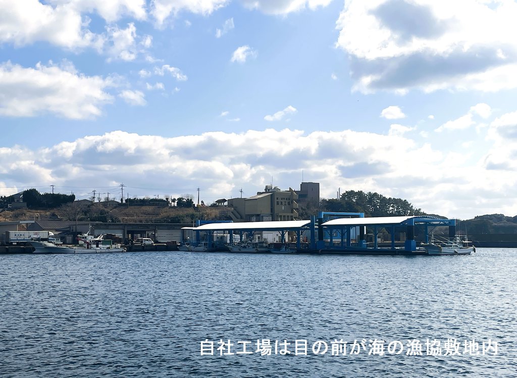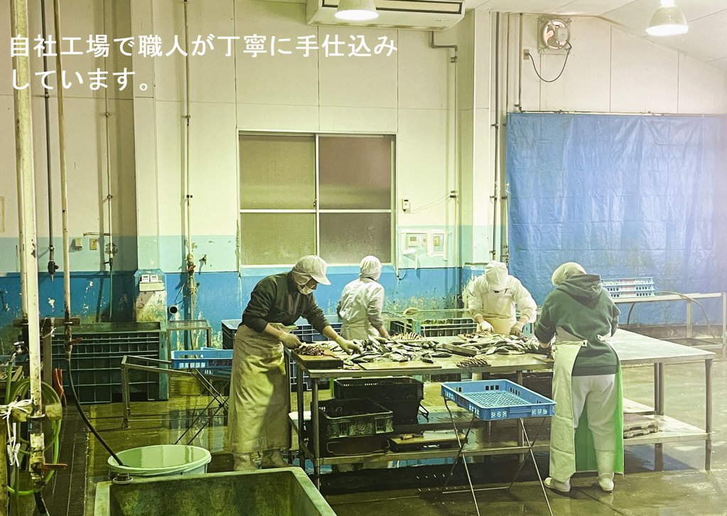 目の前に漁港が広がる当社では、敷地内にある自社工場で今では珍しい全て手仕込みで、丁寧にひとつひとつ加工しています。干物は素材の旨味を活かすため、薄塩で品よく仕立てています。自慢の逸品をぜひお召し上がりください。